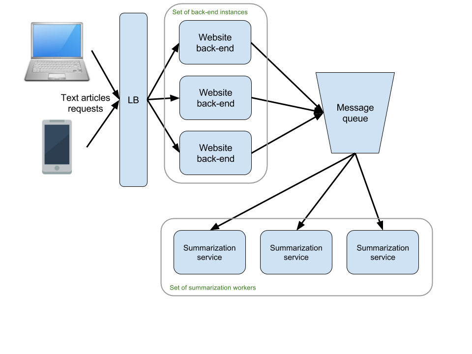To achieve that we could have an additional layer that receives the summarization requests and forwards them to the queue. We already have the website, which sends jobs to the queue from its backend. And it’s a good idea to have this website live behind a load balancer anyway with the possibility to run multiple instances of the website to handle increased traffic. The mobile app could be sending its summarization requests to the backend of the site, possibly over HTTP to a RESTful API. This way there will be one backend with multiple front-ends (web and mobile).